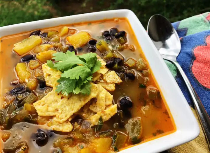 Our autumnal take on a classic, Southwest soup! Local peppers and autumn squash swim around zesty broth with black beans, lime and cilantro. Garnish with tortilla strips for that added crunch!