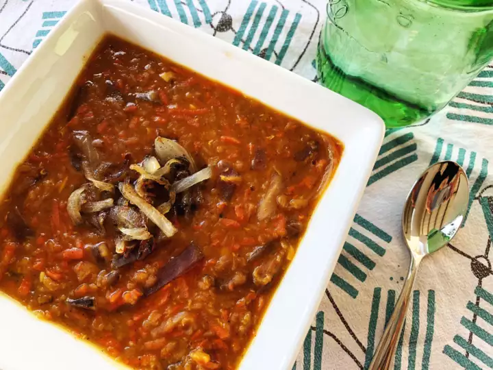 This soup is a lovely shade of red from the beets and full of protein and fiber from the lentils. Caramelized onion complements the sweetness of the beets and cardamom adds depth of flavor.