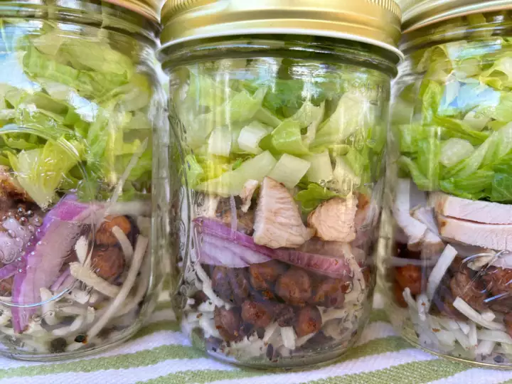 Caesar Salad Jar with Chicken: romaine, kohlrabi, Chickpeas, Red Onion, Chicken Breast, lemon juice, Garlic, Cashews, chili powder, Dijon, Capers, Nutritional Yeast, avocado oil, pink Himalayan salt, black pepper