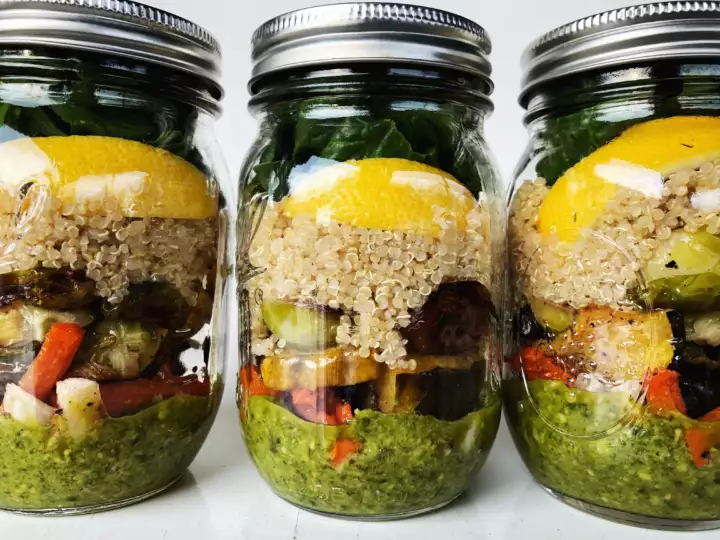 Roasted Autumn Vegetable Salad Jar with Basil Pesto & Chicken