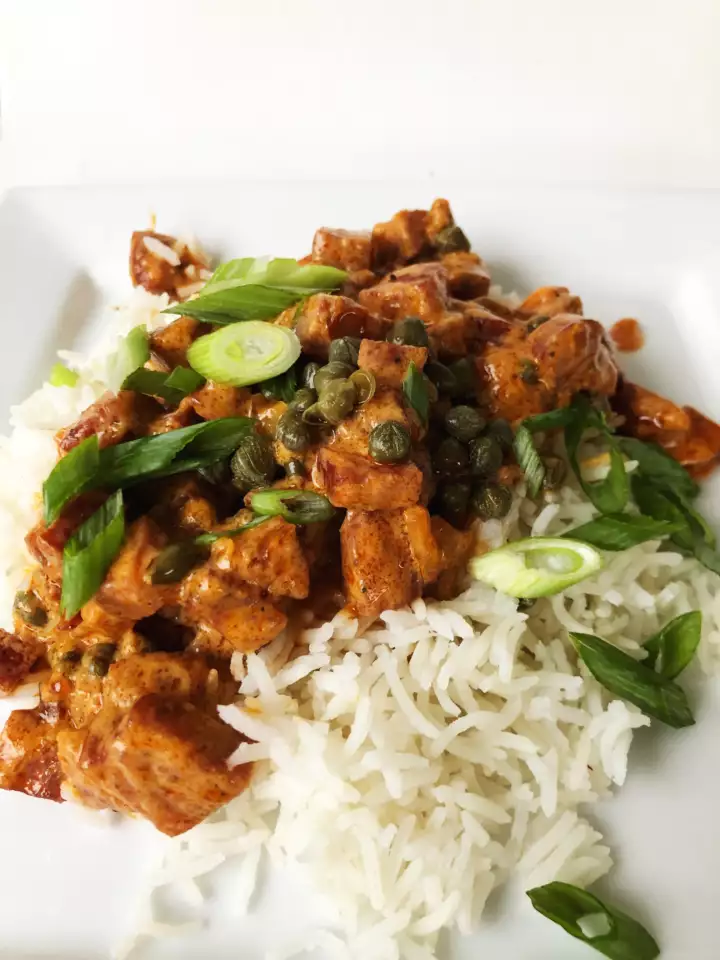 Smoked Mushroom Stroganoff: onion, tomato paste, Dijon, Smoked Paprika, cream, Capers, Mushrooms, pink Himalayan salt, black pepper, avocado oil